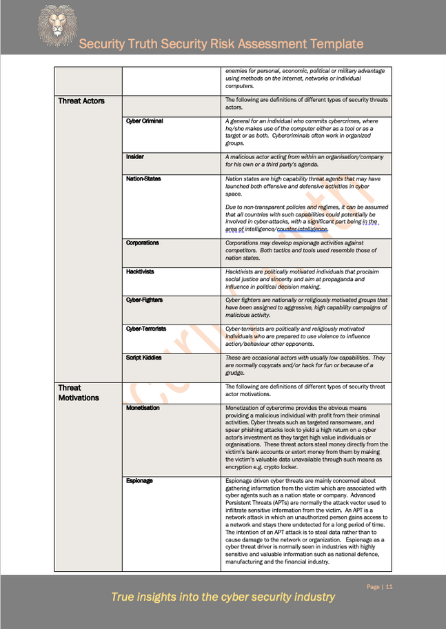 Security Truth's Security Risk Assessment template provides an advanced, well layout risk assessment template that reduces the time and complexity when conducting risk assessments. The Security Risk Assessment is used in conjunction with the Security Business Impact Assessment.